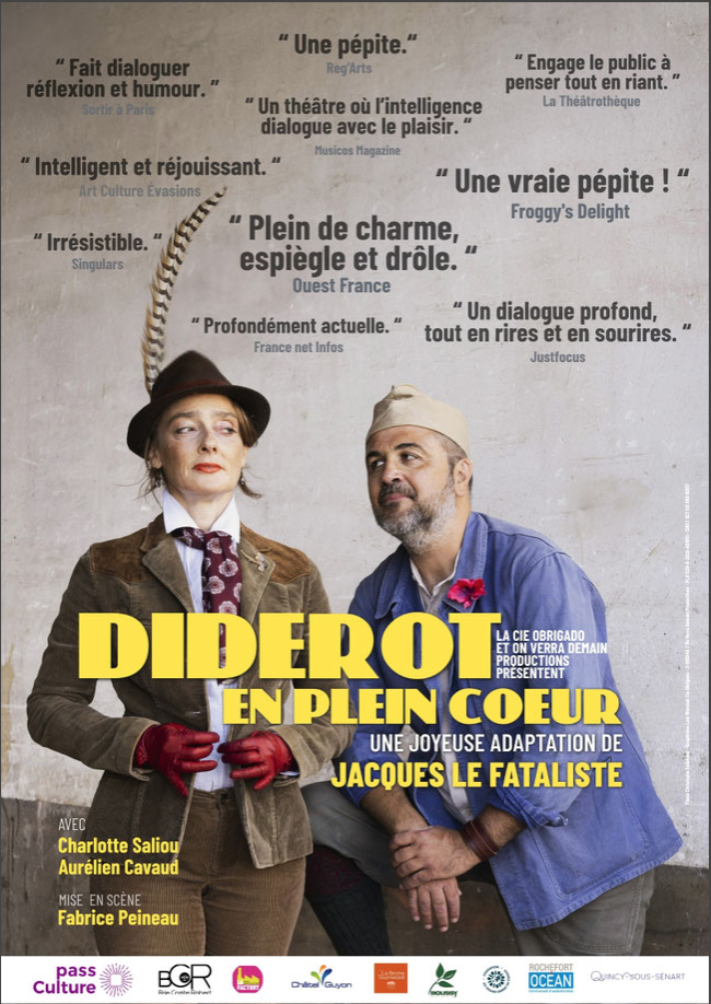 Diderot en plein cœur, une joyeuse adaptation de Jacques le Fataliste, enrichie de nombreux extraits de l'oeuvre de Diderot pour offrir un tour complet de l'auteur.